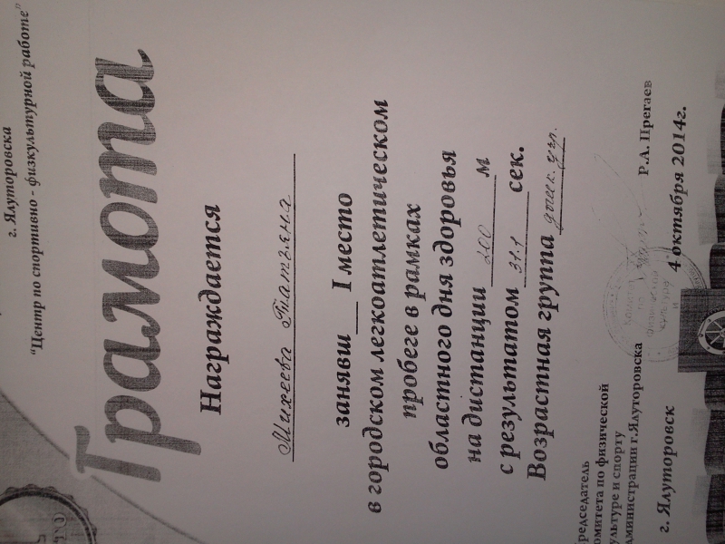 Грамота Михеевой Татьяны за 1 место в городском легкоатлетическом пробеге в рамках областного дня здоровья на дистанции 200 метров